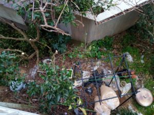 14時少し前、物凄い風がピューッと唸りを立てて通り過ぎました。17mどころではありません。雨の音はしなくなりました。強い風は吹き返しでしょう。明るい光が差して来ました。福が下りて来たので、『行く?』、と玄関を開けると飛び出して暫く考え、裏に行きました。
