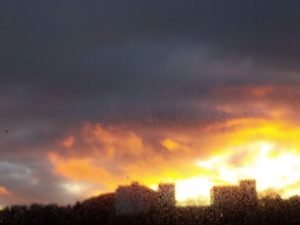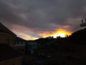 左&中: 17時17分窓越しに撮ったから雨の水滴がガラスの外側についていました。太陽が建物の間に沈んでいます。右: 外から撮りました。