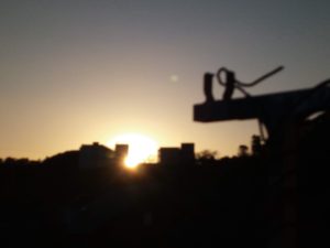 16時55分の沈む夕日は建物より北側になりました。17時25―26分が日没です。