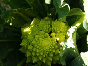 明朝、ロマネスコを収穫して頂きます。市場に出る割合は少ないですが、美味しいんですよ。ブロッコリーは嫌いじゃありませんが、手に入らない野菜を育てる様にしています。手前の2つのロマネスコが今朝顔を急に出して来ました。気温や雨などでその気になったのでしょうね。昨日までは葉で顔を覆って恥ずかしそうにしていました。