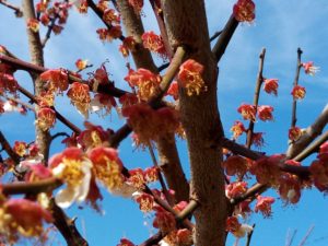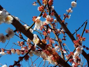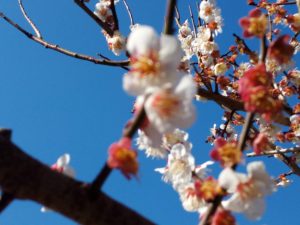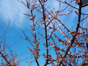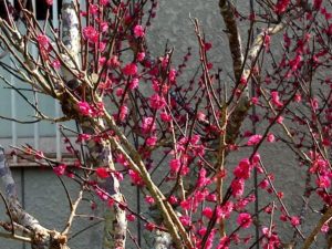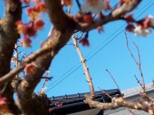 実梅と同じ様に昨年からお世話を始めた鹿児島紅もそれに応えて一緒に咲いて呉れました。昔は花の時期がずれていました。今年は、ほぼ一緒に咲いて呉れ、沢山の蜂やハナアブたちが紅白の花の間を行ったり来たりしていました。