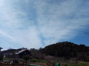 風の強い空は綺麗に晴れていますが、西南西―東北東へと薄っすらブリッジが掛かっています。