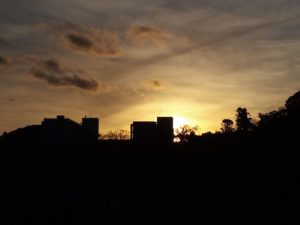 右: 昨日の夕日。真ん中の校舎より太陽が北に沈んで行きました。