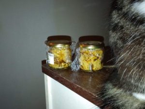 トラ子が帰って来た時、”オシャカナ”(彼が理解する日本語の一つ)と言ったら、珍しく脚にスリスリしてお願いしていた(笑)。鰹の冊を3-4㎝位切って上げました。『良かった!さっきジュレを半分にして置いたんだ。胃袋はたっぷり空きがあるから、全部食べられるよ。』