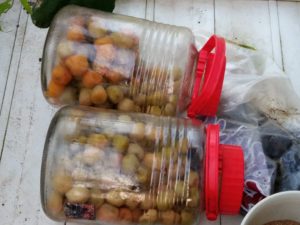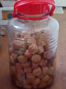 写真は左上から順に、梅が届いて下処理をして塩漬け、一週間程で水が上がり始め、更に一週間経つと梅の実の上まで水が上がり、このまま一月近く置きました。去年2020年は夏休みに入って暫くして明けました。梅雨が明けて物干しで瓶毎、縦にしたり、寝かせたりしながら日に当てました。2日間、お天気が安定している時にザルで天日干しをすると二瓶が一瓶に納まって仕舞いました。梅酢は早速別瓶にとって漬物作りに利用です。梅酢と梅干しは我が家のサプリメント兼胃腸薬です。