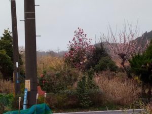 Eさんのお庭で、朱色のボケは薄青いローズマリーの隣で咲き誇っていました。モクレンも紫色の花を上げていました。我が家のラッパ水仙も咲き始めました。