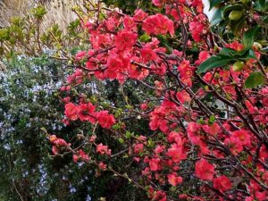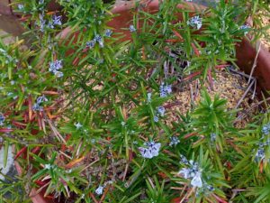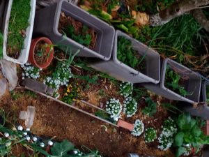 苺畝です。去年生き残って呉れたアイベリーや佐賀ほのかを初めて地植えにしてみました。昨日使った写真ですが、向きを変えてみました。面白いもので向きを変えたら、私の目線が後ろのプランターの中(一番左が苺&中と右はジャガイモ)に行きました。縦型の時は全く気にしていませんでした。右は咲き出した玄関アプローチのローズマリーです。