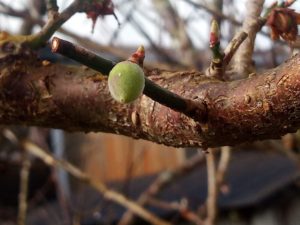 買物に行った時に撮る桜の樹、今日は蕾が広がっていました。中: 我が家の実梅がガクと蕊を脱ぎ捨てました。少しずつ緑の実を見せ始めました。未だ直径5mmの小さな実です。でも、とても嬉しいです。健康に育て~!剪定跡からは赤い葉芽が覗いています。