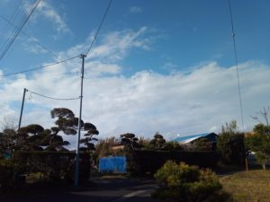 買物に行って来ました。青空が広がる中、雨に濡れた植物達がキラキラしています。西南西から帯状の灰色の雲が近付いて来ていますが、降ったとしても大したことは無いでしょう。