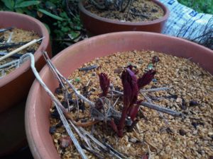 去っていく夕立雲。以下は我が家の芍薬の芽です。8鉢中一つの芽が先日まで見えませんでしたが今日はハッキリ出ていました。