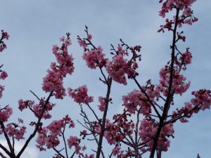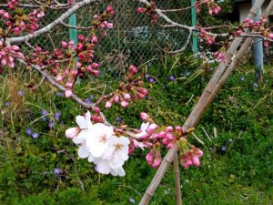 8時前、小さな雨粒がガラスに当たり始めました。農道の桜が満開です。ハナカイドウも一月近く早く満開になりました。
