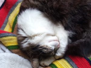8時半過ぎ、タイガーさんが昼寝にやって来ました。カリカリを食べて、火の無い炬燵に入りzzz。さっきまで私の膝をチョイチョイ、としていたのに…寝るのが早いね。左からうめ、奥がトラ子;福、タイガーさん。