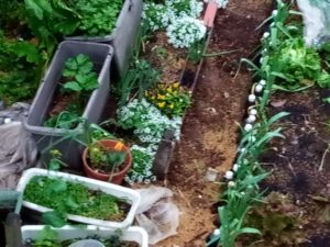 柿若葉がハッキリして来ました。スイートアリッサムの横の鉢にあるのが4年間寝かせたチューリップです。ズームアップします。