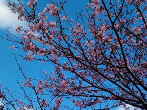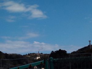風が無いのかなぁ…煙が真っ直ぐに上がっている。中学校の桜がこんなに鮮やかです。