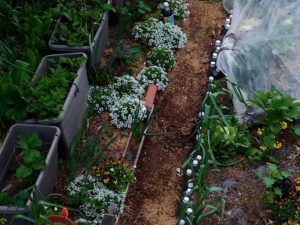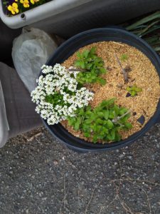 苺畝に植えたスイートアリッサムがドンドン広がっています。畝の近くに居ると小さな蜂やらハナアブが来ています。