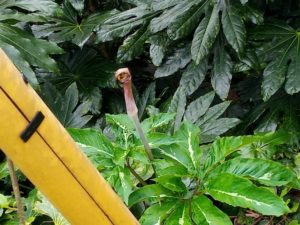 物干しのwinter-sowing、左から本日蒔きの強力米寿、ゴーヤ、真ん中が茄子、トスカーナバイオレット、南瓜。ハナカイドウの蕾と花、今年も出ました、蝮草。全草毒なので、どうやってご退場願おうかな。