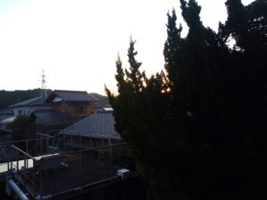 5時22分の夜明け。日の出9分前です。家々の屋根が濡れています。猫達が寒がるわけですね。福は昨夜の夜勤のせいで既に昼寝です。8時近くになったらお隣にご挨拶に行くのでしょうね。5時31分が日の出です。