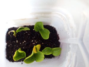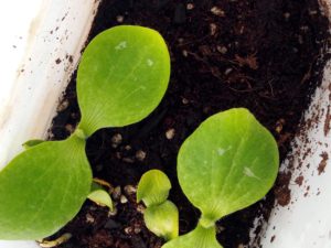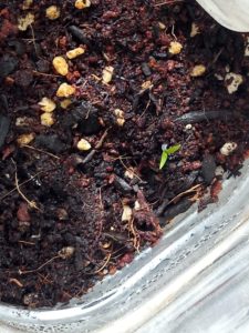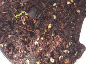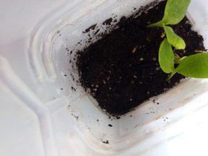 14時、双葉が出ました!!左から茄子、中がトスカーナバイオレット、右が元々のボトルの南瓜です。