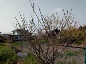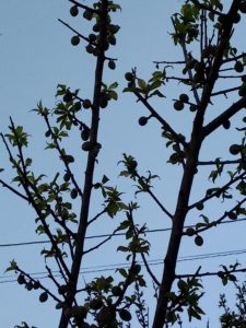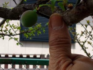 梅の実を着けた枝を大きく広げた樹は新葉を出しています。これから強くなる陽射しから、雨から梅の実を守るために葉を広げて行きます。