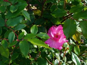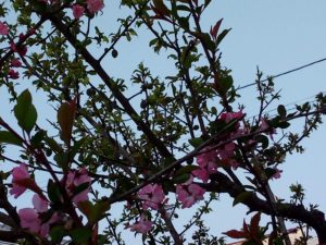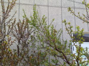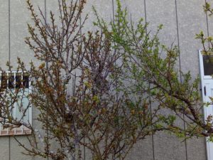 折角お日様が照っているので、表で日を浴びよう。左: 玄関前の枝は梅の実を着けて頑張ってくれている。中: 一番西の枝は実は津k手居ないけれど、ハナカイドウを支えている。右: 鹿児島紅にも赤い葉が出て来ました。