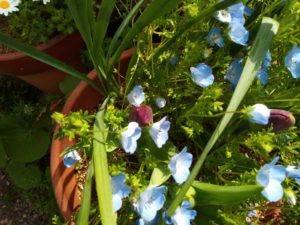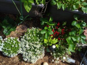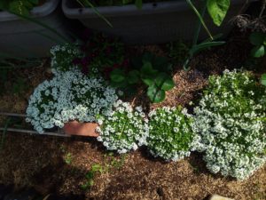 左&中: スイートアリッサムの花が苺の花に蜂を呼んで呉れます様に、と植えましたが、凄く広がっています。右: キャンザスプラウドの赤い蕾が上がって来ました。。