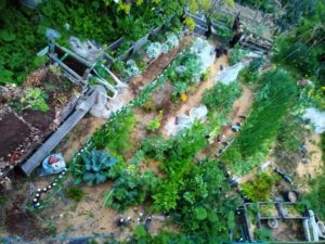中央の茶色の部分は前作の白菜を片づけて、表面を鎮圧し鎌で筋を付けて汐留長葱と万能葉葱の種を蒔いて、軽く筋を指で閉じて、庭の刈草を上からドン!と載せて、一週間位ネットを掛けて置きました。てなんか園芸書の知識って凄く制限されているなぁ、って感じます。今は草の勢いが早いけれど、未だ凄くは無いから自然農の真似事ができているのかしら?通路には、花が上がっていたホウレンソウの残渣を置いてみたけれど、此処で葉茎は朽ちても種を落したりするのかな?