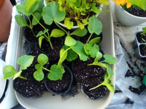 左:  物干しで夜を過ごした南瓜は北を向いて居ます。右: 今日鉢上げするトマト苗です。