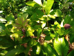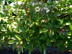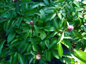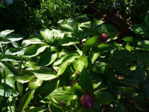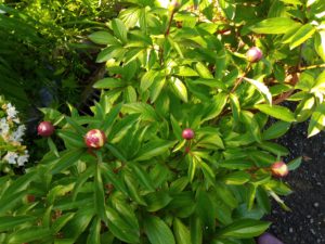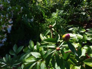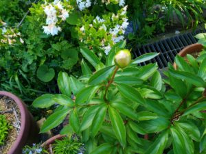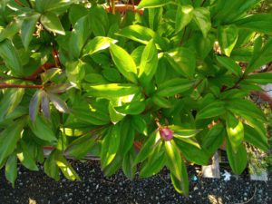 今朝の芍薬です。雨で蕾が更に膨らんでいます。左: 一番先に発芽した仔。中: オリエンタルゴールドは蕾が2つついて居ます。右: 5―6個蕾を着けた株。