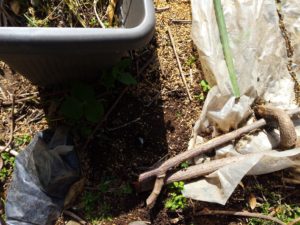 お隣の小父ちゃんは今日、南瓜を植えるつもりらしいです。シートが片づけられていました。