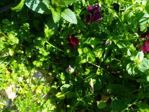 左: 5畝に出ている赤ワイン色のビオラの手前に、薄紫と淡いオレンジが入ったビオラが咲いていました。