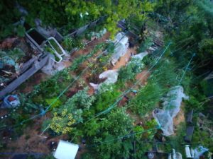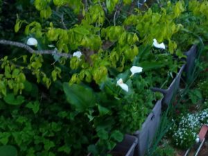 降りて来たのは、少しの水分かも知れませんが、風で倒れていた玉葱がシャン!と起きました。4時52分頃の庭です。