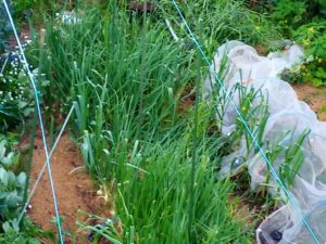 左: お隣の玉葱もくんずほぐれつ、起き上がって来ました。一寸肥料を食べ過ぎた色です。268x216