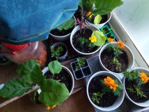廊下で待機中の苗達、未だ二週間は物干しと廊下を出たり、入ったりですね。