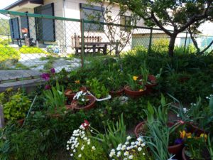 右: Yさんのお庭です。ネットが掛かっているから暗くなっていますけど、綺麗に咲いた花には沢山蜂が来ていました。