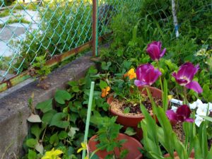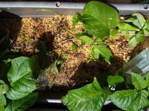 左: ジャガイモのプランターで茎が伸びて来たので、寝かしてボトルで重石をしました。