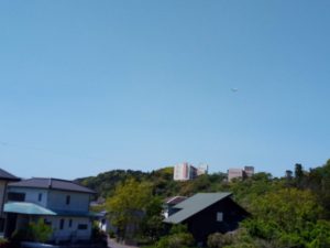 左: P3Cが来ました~!丘の上の右側の校舎の上空です。物干しから撮りました。実際にみていたら、わぁっ!低空だ!、と驚いたと思いますよ(笑)。写真ではポチッとした点でしかありません。