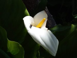 左: カラーにハナアブが来ています。ハナアブは蠅の仲間です。