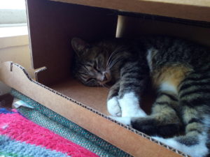 左: ダンボールベッドの下の部分を外したのは福です。福は足が段ボールベッドの外した上に乗って居ます。多分、蹴飛ばしたんでしょうね。。