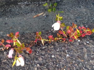 右: こちらは線路の北側の我が家がある住宅地の月見草。葉が紅葉していたので、何の草かと思いました。今朝の寒さでやられたみたいです。我が家のパンジーがぐったりしたのが分かりますね。震えあがったのでしょうね。