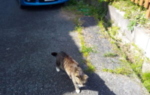 庭仕事に夢中になっていたら、突如、西隣さんの庭で喧嘩の声が聞こえました。見ると、トラ子とうめが向かい合って!?喧嘩をしています。トラ子が全速力で逃げて来ました。エッ!?あ、黒ちゃんだ。黒ちゃんvsうめの戦いでした。