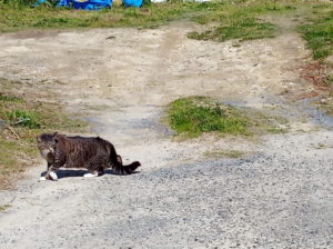 右: 少し時間が経ってから、青い車(写真の右手)から用心しながら、屁っ放り腰で遠ざかろうとするうめ(笑)。この直後、黒ちゃんの急襲があり、黒い車の下にうめは潜り込み、セーフ!。
