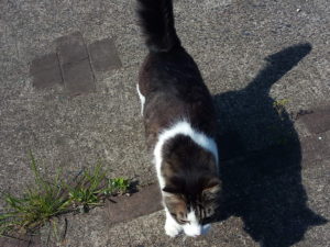 うめがカリカリを食べに来たので、母猫が仔猫を呼ぶときの”ンゴロ…”をやったらうめがゴロゴロ言ってくれました。『下手だけど、オカアシャン猫のつもりになっているのよね。気持ちには感謝するわ。』、てなとこなんでしょう。