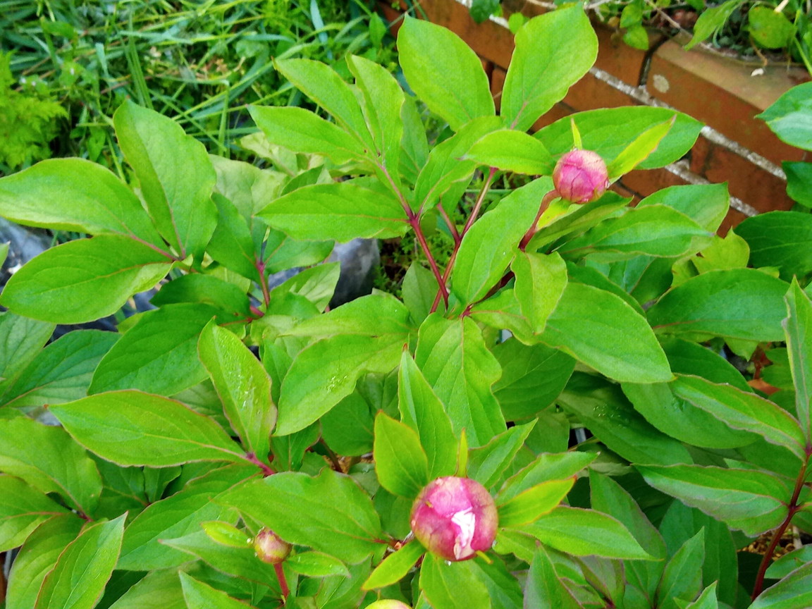 蕾に色が現れると、私にとっては咲いたも同然。テンションは下がりはしないけれど、花色が分かるまでの謎解きが大好きです。写真は、これは白い氷点です。でも、芍薬は牡丹の系統だからか、茎葉が始めは赤くて、少しずつ緑色が個性に合わせて増えて行きます。今は白っぽい蕾の花も、地上に顔を出した時はワインカラーと赤茶色を混ぜたような発芽です。