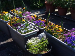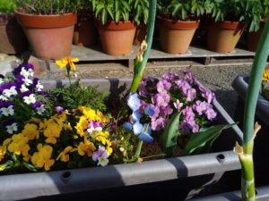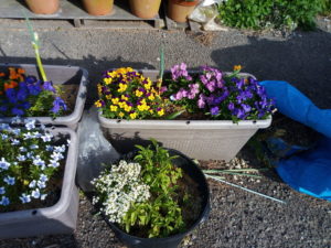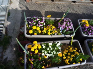 右: 分かり難いですが、各プランタに一つずつマリゴールドをを追加しました。どうやらビオラの花やマリゴールドの葉を齧るのはナメクジの様です。花弁に銀色の痕跡がありました。植穴に植物剛力プラスの一万倍液を500㏄位入れ、ドブ漬けしていたマリゴールドを植えました。