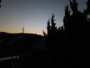 写真は4時43分の空です。東が暗く見えるのは鉄塔に焦点を合わせた為です。