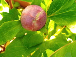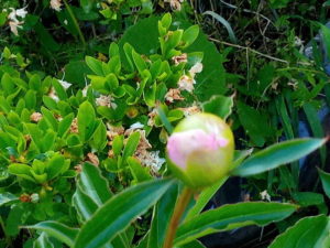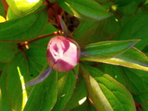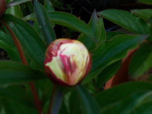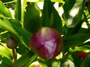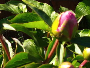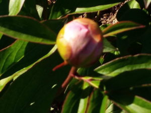 一日で大きく膨らんで来た芍薬の蕾は微かに花色を見せ始めました。