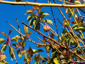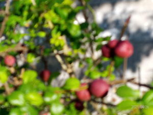 パソ塾の庭の植物達。左はボケの実。ボケているのはシャレではありません。中&右: 一体何の実なんでしょうねぇ。綺麗に色付いています。