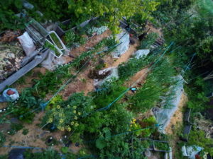 左: 庭に定植した南瓜の本葉が大きくなりました。