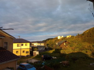 5時40分で雲は多めながら、この東の写真は焦点のマジックです。西南西は明るい陽射しが照らしています。