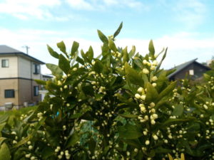 西隣さんの温州ミカンに花が沢山着いていますよ~!白い花がびっしりです。